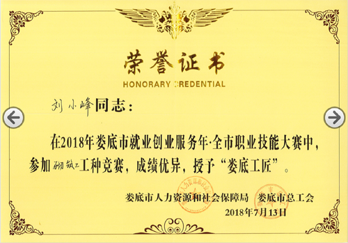 2018年7月13日,由婁底市人力資源和社會保障局、婁底市總工會、婁底市住房和城鄉(xiāng)建設局主辦的“2018年婁底市就業(yè)創(chuàng)業(yè)服務年.全市職業(yè)技能大賽”圓滿落幕。我公司選送的參賽選手劉小峰獲職工組砌筑工競賽二等獎,并被授予“婁底工匠”。